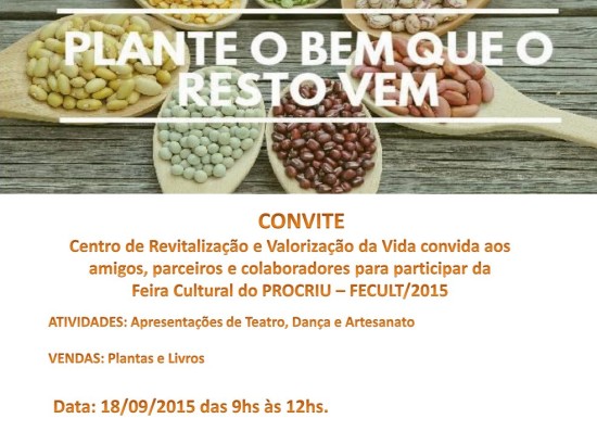 Segue o convite da FECULT – Feira Cultural do CRVV/ Procriu que todos os anos reúne a produção do que foi feito nas oficinas durante o ano.